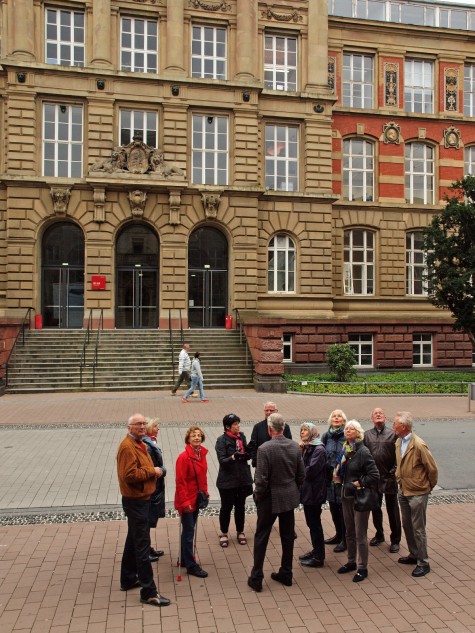 1961 haben die bis heute befreundeten Kommilitonen Ihr Studium an der damaligen TH Darmstadt begonnen. Viel Zeit ist seither vergangen, und viel hat sich am Campus Stadtmitte verändert. In einer knapp zweistündigen auf die Teilnehmer zugeschnittenen Campusführung brachte Brigitte Kuntzsch den Ehemaligen TH-lern den heutigen Studienstandort Stadtmitte wieder näher. Die Führung endete passend zum Studiengang im Maschinenbaugebäude Magdalenenstraße.